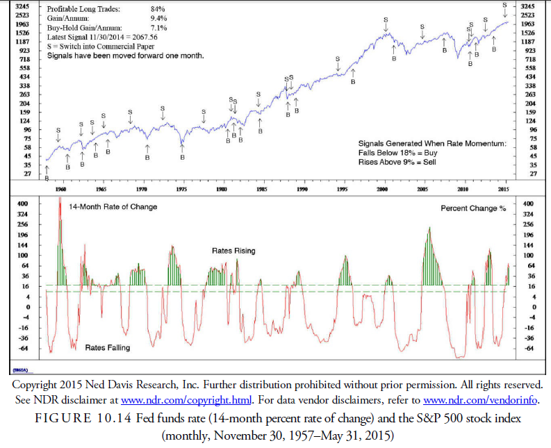 Figure 10.14 shows a chart of the 14-month percent change in the fed funds rate and its corresponding signal for the stock market. Ned Davis Research, Inc. has found that a momentum decline of 18% is sufficient to generate a buy signal in the stock market, and a 9% or more rise in momentum is sufficient to sell the stock market. The signals have been 84% accurate since 1957.
