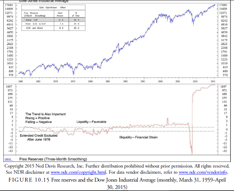 Free reserves are the amount of money banks have over that which they are required to keep for risk management that is free for lending. It is a figure that has been used in stock market timing for many years. After the quantitative easing by the Fed in 2008, excess reserves in the banking system swelled because the downward pressure from the purchase of bonds on the long-term interest rate squeezed the yield curve, making it unprofitable for banks to lend. Added to this concern was the introduction of the Dodd-Frank Bill that placed many undefined restrictions on the banking system. The net of all this was that banks held back from lending, and their excess cash from earnings remained in house, thus enlarging their excess reserves. Because there is a positive correlation between excess free reserves and the stock market, the stock market advanced strongly. The model in Figure 10.15 by Ned Davis Research, Inc. shows how increased liquidity in the banking system from excess free reserves coincided with a strong stock market. Whenever the three-month smoothed average of free reserves rose above 0.47, the stock market had an annualized gain of 12.0%, and when the free reserves declined below -0.34, the stock market declined an annualized 8.2%.