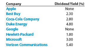 As can be seen, the dividend yield varies widely across firms. Growth firms tend to retain their earnings to fund future growth. Thus, Apple and Google pay no dividends, and Hewlett-Packard has a relatively small dividend. Common stockholders of these companies expect to earn most of their return from stock price appreciation. In contrast, Duke Energy and Verizon Communications are regulated utilities that provide a return to common stockholders mostly through dividends. Best Buy, Coca-Cola, and Microsoft provide a mix of dividends and expected stock price appreciation to their common stockholders.