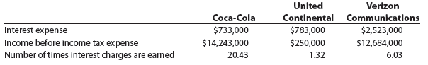 Compare this to the number of times interest charges are earned for United Continental Holdings (an airline), and Verizon Communications (a telecommunications company) shown on the next page (in thousands):