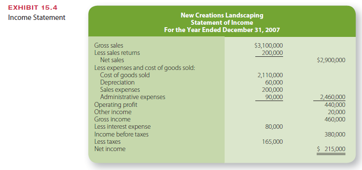 The income statement, sometimes called a profit-and-loss statement or P&L for short, summarizes the firm’s financial performance for a given time interval, usually one year. A sample income statement is shown in Exhibit 15.4. Some organizations calculate the income statement at three-month intervals during the year to see whether they are on target for sales and profits. The income statement shows revenues coming into the organization from all sources and subtracts all expenses, including cost of goods sold, inter- est, taxes, and depreciation. The bottom line indicates the net income—profit or loss—for the given time period.