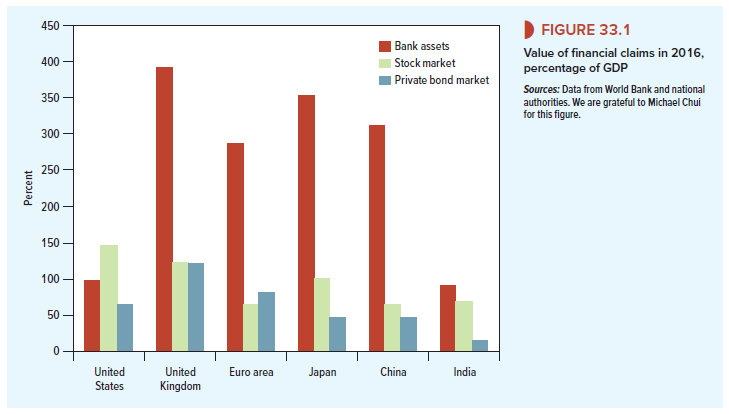 In most of this book, we have assumed that a large part of debt financing comes from public bond markets. Nothing in principle changes when a firm borrows from a bank instead. But in some countries, bond markets are stunted and bank financing is more important. Figure 33.1 shows the total values of bank loans, private (nongovernment) bonds, and stock markets in different parts of the world in 2016. To measure these financial claims on a comparable basis, the amounts are scaled by gross domestic product (GDP).