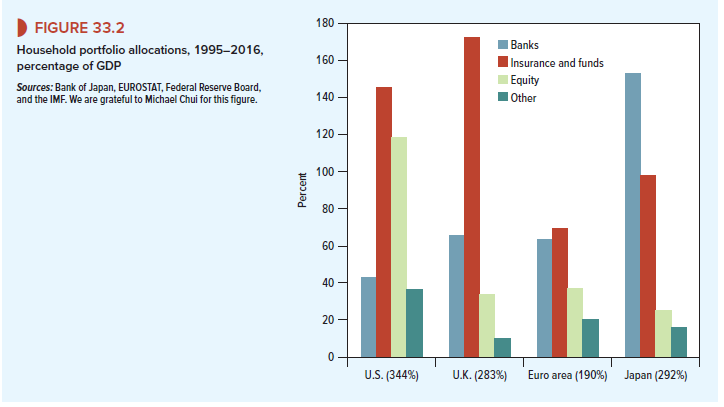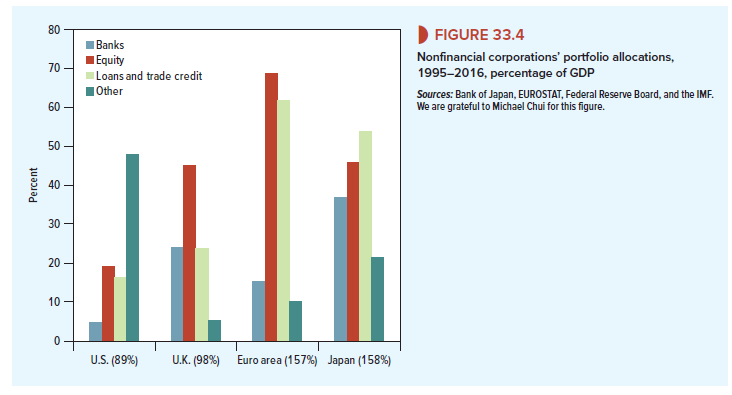Figures 33.1 to 33.4 show that just drawing a line between market-based, “Anglo-Saxon” financial systems and bank-based financial systems is simplistic. We need to dig a little deeper when comparing financial systems. For example, more equity is held directly by households in the United States than in the United Kingdom, and the portfolio allocations of households, nonfinancial corporations, and financial institutions are also significantly different. In addition, we noted the large cross-holdings of shares among European corporations. Finally, Japanese households put significantly more of their savings in banks and Japanese corporations use trade credit much more than in other advanced economies.