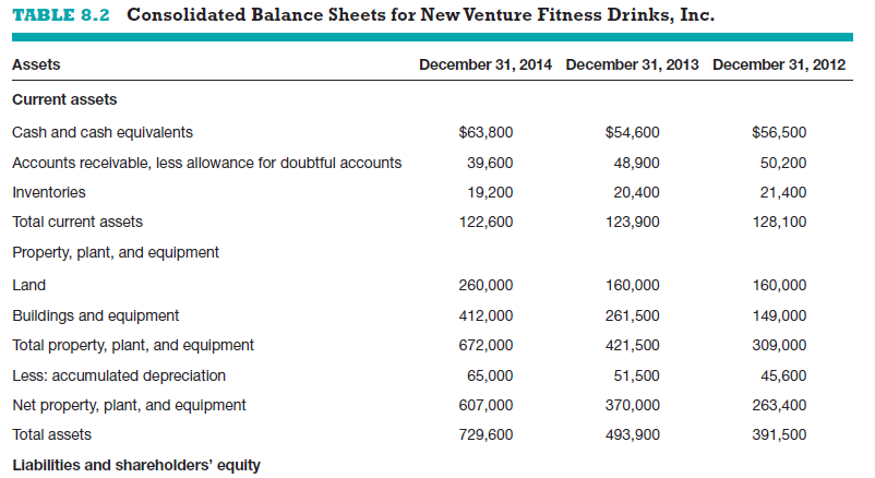 The consolidated balance sheet for New Venture Fitness Drinks is shown in Table 8.2. Again, multiple years are shown so that trends can be easily spot- ted. When evaluating a balance sheet, the two primary questions are whether a firm has sufficient short-term assets to cover its short-term debts and whether it is financially sound overall. There are two calculations that provide the answer to the first question. In 2014, the working capital of New Venture Fitness Drinks, defined as its current assets minus its current liabilities, was $82,500. This number represents the amount of liquid assets the firm has available. Its current ratio, which equals the firm’s current assets divided by its current liabilities, provides another picture of the relationship between its current assets and current liabilities and can tell us more about the firm’s ability to pay its short-term debts.