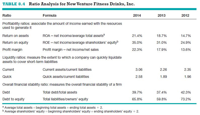 Ratio analysis The most practical way to interpret or make sense of a firm’s historical financial statements is through ratio analysis. Table 8.4 is a summary of the ratios used to evaluate New Venture Fitness Drinks dur – ing the time period covered by the previously provided financial statements.