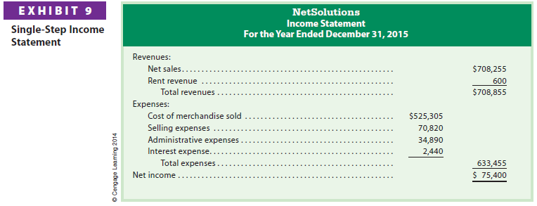 An alternate form of income statement is the single-step income statement. As shown in Exhibit 9, the income statement for NetSolutions deducts the total of all expenses in one step from the total of all revenues.