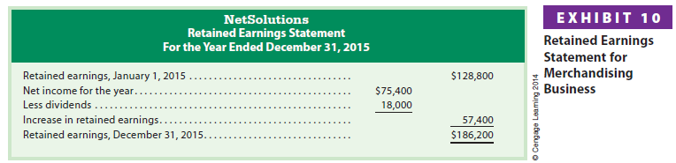 The retained earnings statement for NetSolutions is shown in Exhibit 10. This statement is prepared in the same manner as for a service business.