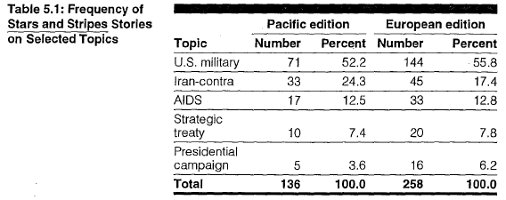 Beyond simply counting, evaluators might look for an association between two or more variables. In the Stars and Stripes assignment, the frequency of news articles on various topics was compared between the Pacific and European editions. In the language of content analysis, the variable “topic” was compared to the variable “edition.” Topic had the subcategories military, Iran-contra, AIDs, strategic treaty, and presidential campaign.