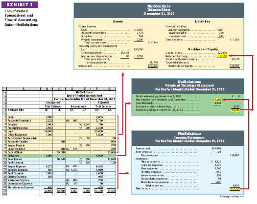 The process of adjusting the accounts and preparing financial statements is one of the most important in accounting. Using the NetSolutions illustration from Chapters 1-3 and an end-of-period spreadsheet, the flow of accounting data in adjusting accounts and preparing financial statements are summarized in Exhibit 1.