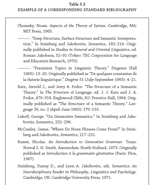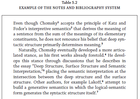 What are the shortcomings of this system? Take for example footnote 6 of table 5.2. It tells us that Lakoff’s article is in the previously cited miscellaneous volume Semantics. Where was it cited? Luckily, in the same paragraph, and the reference appears in the table’s footnote 5. What if it had been cited ten pages earlier? Should we repeat the reference for convenience? Should we expect the reader to check the bibliography? In this instance, the author-date system is more convenient.
