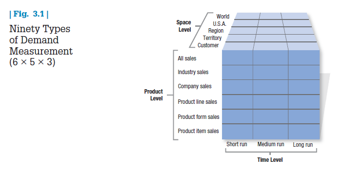 Companies can prepare as many as 90 different types of demand estimates for six different product levels, five space levels, and three time periods (see Figure 3.1). Each serves a specific purpose. A company might forecast short-run demand to order raw materials, plan production, and borrow cash. It might forecast regional demand to decide whether to set up regional distribution.