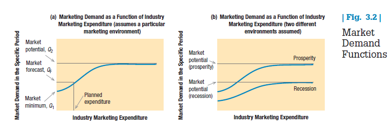 The phrase “for a given market environment” is crucial. Consider the market potential for automobiles. It’s higher during prosperity than during a recession, as illustrated in Figure 3.2(b). Market analysts distinguish between the position of the market demand function and movement along it. Companies cannot do anything about the position of the market demand function, which is determined by the marketing environment. However, they influence their particular location on the function when they decide how much to spend on marketing.