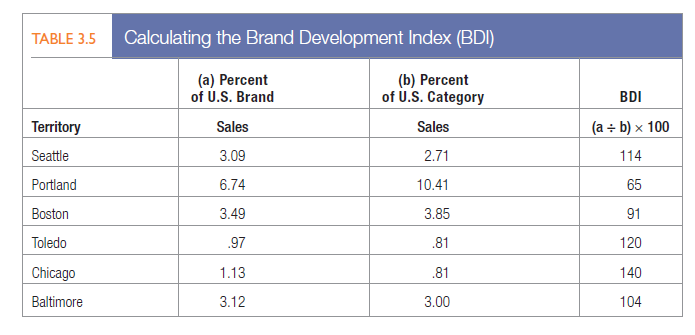 Many companies compute area indexes to allocate marketing resources. Suppose the drug company is reviewing the six cities listed in Table 3.5. The first two columns show its percentage of U.S. brand and category sales in these six cities. Column 3 shows the brand development index (BDI), the index of brand sales to category sales. Seattle has a BDI of 114 because the brand is relatively more developed than the category in Seattle. Portland’s BDI is 65, which means the brand is relatively underdeveloped there.