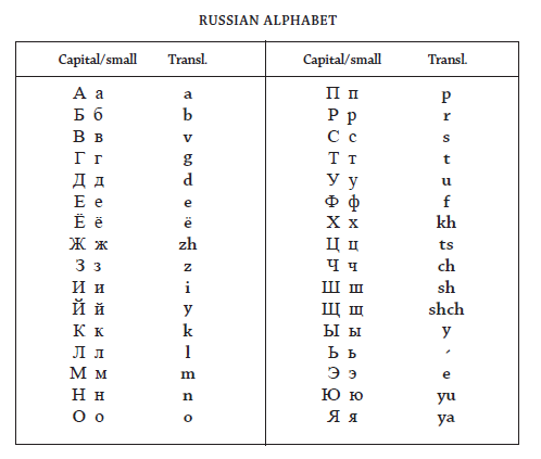 Transliteration is used for the majority of historic geographical names, as well as for words that do not have an English-language equivalent. Table 6.2 shows the rules of transliteration of the Greek alphabet (which can be transliterated, for example, for a thesis in philosophy) and the Cyrillic alphabet (for Russian and some other Slavic languages).