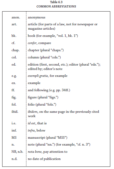 Abbreviations. Table 6.3 provides a list of common abbreviations. Specific subjects (paleography, classical and modern philology, logic, mathematics, etc.) have separate series of abbreviations that you will learn by reading the critical literature on your thesis topic.