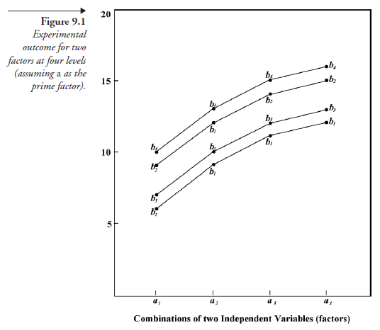 - The four levels of factor b do not have a scale of their own. Instead, they appear as four lines, each consisting of three segments: bj—b2, b2—b3, and b3—b^. Each line looks as if it shows the result of a one-factor-at-a-time experiment with a varying and b kept constant. This is not the case.
