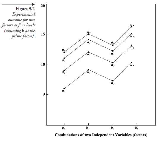 Comparing this figure with Figure 9.1, we notice that the four lines, each corresponding to a level of a, are again parallel to each other, though the shapes of all the lines in Figure 9.2 are different from those in Figure 9.1. We may thus summarize that whatever the shape of the lines corresponding to different levels of the second factor, the lines being parallel is the criterion test for no interaction between the two factors. Now, though it is desirable to identify one of the two factors as the prime factor, it may often be impossible, even presumptuous, to do so. The mere fact of the lines being parallel should be an adequate test for no interaction.