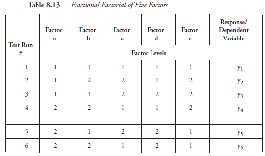 Having arrived at the logical end point for discussing full-factorial experiments with four factors, we need to reflect on what lies ahead. We mentioned early in this chapter that in many contexts, for example, manufacturing, confronting a large number of factors is not uncommon. If the number of factors is ten, for instance, even at only two levels (let alone three and more levels), with full factorial, we have 210 = 1,024 factor combinations! Obviously, there ought to be some shortcut to avoid the need to run such a large number of replications. A selected small number of combinations, referred to as a fractional factorial, are often found adequate for the initial screening of the factors. We mentioned this earlier, while referring to Taguchi.