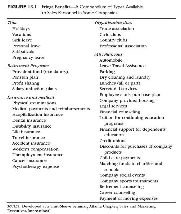 Fringe benefits, which do not bear direct relationships to job performance, range from 25 to 40 percent of the total sales compensation package. Some are required by federal and state law—for example, payments for social security premiums, unemployment compensation, and worker’s compensation. Most, however, the company provides for other reasons: to be competitive with other companies in the industry or community, to furnish reasons for employees to remain in the company’s service, and to comply with what employees expect as fringe benefits.