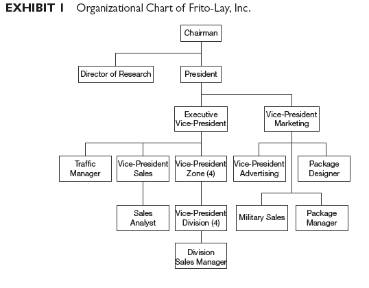 To provide communication with and control over its large sales force, Frito-Lay had developed a complex organizational structure, with three layers of geographical subdivisions of authority. The national market was divided into four zones, and these were subdivided into a total of fourteen divisions. The divisions were further divided into districts, each with a district sales manager and ten or twelve salespeople. The new organizational structure had placed the vice-president of sales under the line authority of the executive vice-president rather than under the vice-president of marketing. The position of vice-president of sales was a staff position, since the district and divisional sales managers were under the authority of their respective district and divisional managers. The relationships are shown in Exhibit 1.