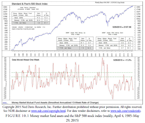 One method of looking at the relationship between assets in money market funds and the stock market is shown in Figure 10.1. It shows the rate of change of money market mutual fund cash flow. The cash flow often comes from investors in the stock market and increases when they are selling stocks because they are “parking” the money in these short-term funds. The Ned Davis Research, Inc. study shows that a high rate of growth in cash flow to these funds occurs at a time when it is favorable to invest in the stock market. This indicator is thus a sentiment indicator as well as a flow of funds indicator. In the past several years, because short-term interest rates have been so low, money has generally been flowing out of the money market funds, and much of it has entered the stock market hoping for a higher return.