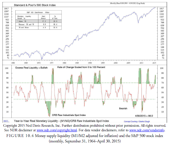 Because M1 is the most liquid portion of M2, a ratio of the two measures the liquidity of M2 and thus the proportion of M2 that can be used immediately for purchase of stocks and other investments. The Ned Davis Research, Inc. chart in Figure 10.4 shows the year-to-year change in this ratio scaled to between 0 and 100. Ned Davis Research, Inc. concluded that when the change advances above 70, the S&P 500 index gains at a rate of 17.2% per year, whereas when the change is 36 or below, the index declines at an annual rate of 4.9%. The liquidity of M2, therefore, is a powerful indicator of stock market direction.