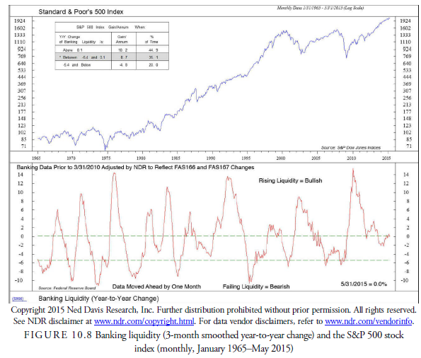 Generally, an increase in loan activity, the amount of loans being created and existing, is a sign of increased business activity. It can also be a sign of increased speculation or a particular period when banks, because the yield curve is so much in their favor, become less prudent in their lending policies. When loan demand increases, it puts upward pressure on interest rates. Conversely, a decrease in loan demand puts downward pressure on interest rates. One measure of bank speculation is the Liquidity Coverage Ratio (LCR). This ratio is the total of Category I financial assets, such as cash, gold bullion, and obligations of the U.S. government divided by the cash necessary to operate the bank for 30 days. Operation of the bank includes payroll, normal business expenses, payments on loans, and so on, that the bank incurs in its normal working mode. As the loan business gets hot, banks tend to loan right to the limit of their LCR. Thus, by following this estimate of bank liquidity, one can measure the risk of the banking system as well as the prospects for higher or lower interest rates. Ned Davis Research Inc., in Figure 10.8, displays a timing system based on the year-to-year change in bank liquidity that has shown excellent promise as a market timing device. It found that when the liquidity increases by 0.1 or more, the banks are becoming liquid and have the resources to lend. This is favorable for the economy and the stock market, which has gained 10.2% at an annual rate in such times. When the liquidity shrinks to -5.4 or below, the stock market declines at an annual rate of 4.8%. The liquidity year-to- year change is thus an excellent forecasting method for the stock market.