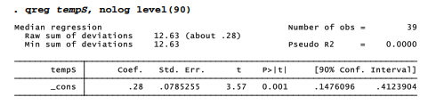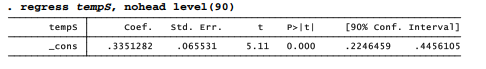 The previous section showed basic applications of rreg and qreg. These commands also can be used in many other ways, from simple to complex. For example, to obtain a 90% confidence interval for the mean of a single variable such as Antarctic air temperature (tempS), we could type the usual confidence-interval command ci: