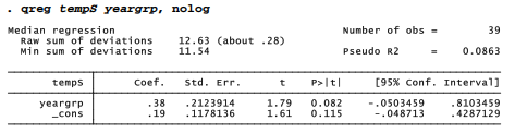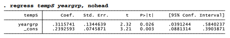 Is that conclusion robust? rreg finds that the robust means differ even more, by .329 °C. That difference too is significant (p = .023).