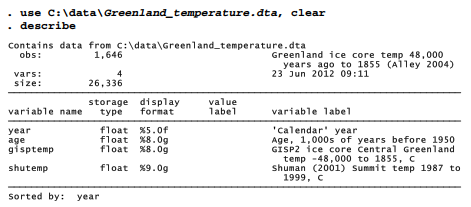 Dataset Greenland temperature.dta contains a famous time series of temperature estimates reconstructed from the GISP2 ice core in central Greenland, covering time from about 50,000 years ago up through 1855 (Alley 2004). In scientific publications on these data, time has been represented by the variable age, in units of thousands of years before present. “Present” had been conventionally defined by the ice researchers to mean 1950. The most recent age in their data is .095, or 95 years before present — in other words, 1855. Ice and snow from more recent years had not consolidated enough to apply the temperature reconstruction method. To keep our example more more intuitive for non-paleoclimatologists, however, a new time variable, year, was generated. year can be read as “calendar years” from -48,000 to 1999. The variable gisptemp contains temperatures reconstructed from the GISP2 ice core. shutemp contains the average annual temperature at the same Greenland location directly measured by scientists over 1987-1999 (Shuman et al. 2001).