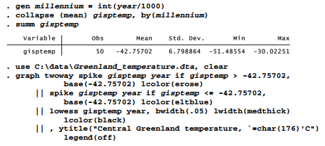 ytitle(“Central Greenland temperature, ‘=char(176)’C”)