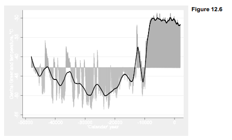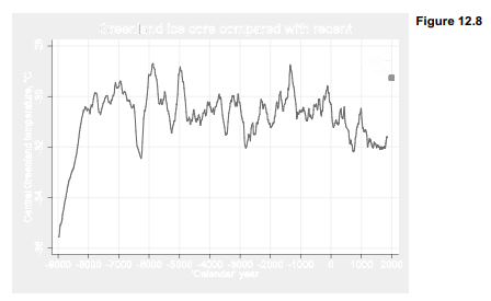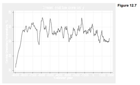 Figure 12.7 graphs a recent segment of the data in Figure 12.6, depicting GISP2 temperatures for the past 11,000 years only. Graphs much like this particular time plot have been a source of remarkable confusion.