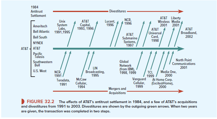 Figure 32.2 shows some of AT&T’s acquisitions and divestitures. Before 1984, AT&T controlled most of the local and virtually all of the long-distance telephone service in the United States. (Customers used to speak of the ubiquitous “Ma Bell.”) Then in 1984, the company accepted an antitrust settlement requiring local telephone services to be spun off to seven new, independent companies. AT&T was left with its long-distance business plus Bell Laboratories, Western Electric (telecommunications manufacturing), and various other assets. As the communications industry became increasingly competitive, AT&T acquired several other businesses, notably in computers, cellular telephone service, and cable television. Some of these acquisitions are shown as the green incoming arrows in Figure 32.2.
