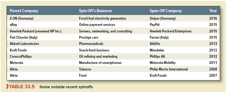 eBay was not alone in deciding to spin off. Table 32.5 lists a few other notable spinoffs of recent years.
