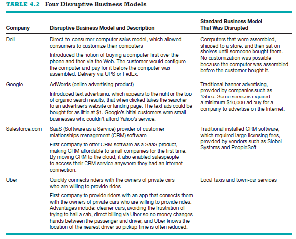 The second category is disruptive business models. Disruptive business models, which are rare, are ones that do not fit the profile of a standard busi- ness model, and are impactful enough that they disrupt or change the way business is conducted in an industry or an important niche within an indus- try.8 In Table 4.2, we describe actual disruptive business models that were used by four different companies.