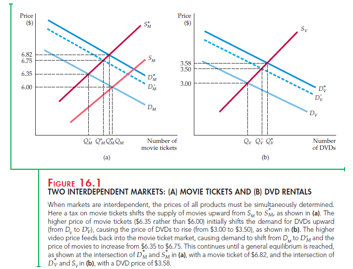 What about the market for movies? The original demand curve for movies presumed that the price of DVDs was unchanged at $3.00. But because that price is now $3.50, the demand for movies will shift upward, from DM to D ‘M in Figure 16.1 (a). The new equilibrium price of movies (at the intersection of SM and DM) is $6.75, instead of $6.35, and the quantity of movie tickets purchased has increased from QM to Q M. Thus a partial equilibrium analysis would have underestimated the effect of the tax on the price of movies. The DVD market is so closely related to the market for movies that to determine the tax’s full effect, we need a general equilibrium analysis.