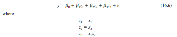 Note that equation (16.5) reflects Tyler’s belief that the number of units sold depends linearly on selling price and advertising expenditure (accounted for by the β1x1 and β2x 2 terms), and that there is interaction between the two variables (accounted for by the β3x1x2 term).