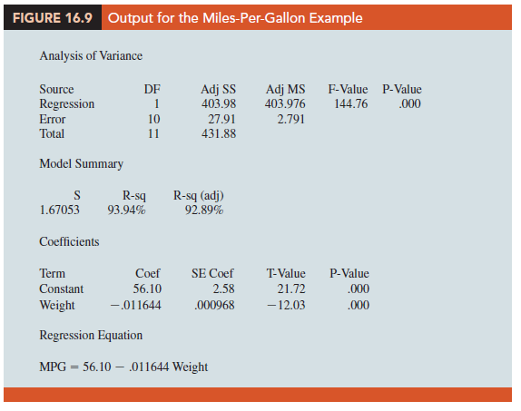 In showing how the general linear model can be used to model a variety of possible relationships between the independent variables and the dependent variable, we have focused attention on transformations involving one or more of the independent variables. Often it is worthwhile to consider transformations involving the dependent variable y. As an illustration of when we might want to transform the dependent variable, consider the data in Table 16.4, which shows the miles-per-gallon ratings and weights for 12 automobiles. The scatter diagram in Figure 16.8 indicates a negative linear relationship between these two variables. Therefore, we use a simple first-order model to relate the two variables. The output is shown in Figure 16.9; the resulting estimated regression equation is
