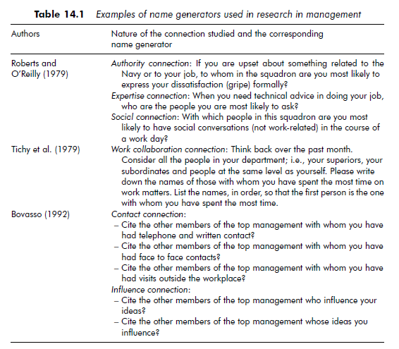 Name generators Whether researchers use surveys or conduct interviews, relational data can be collected by means of ‘name generators’. A name generator is a question either about the links the person being questioned has with the other members of the network or about his or her perception of the links that exist between members of the network. Table 14.1 gives some examples of name generators used in management research. Several collection techniques are possible.