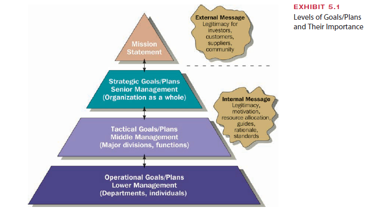 Exhibit 5.1 illustrates the levels of goals and plans in an organization. The planning process starts with a formal mission that defines the basic purpose of the organization, especially for external audiences. The mission is the basis for the strategic (company) level of goals and plans, which in turn shapes the tactical (divisional) level and the operational (departmental) level.4