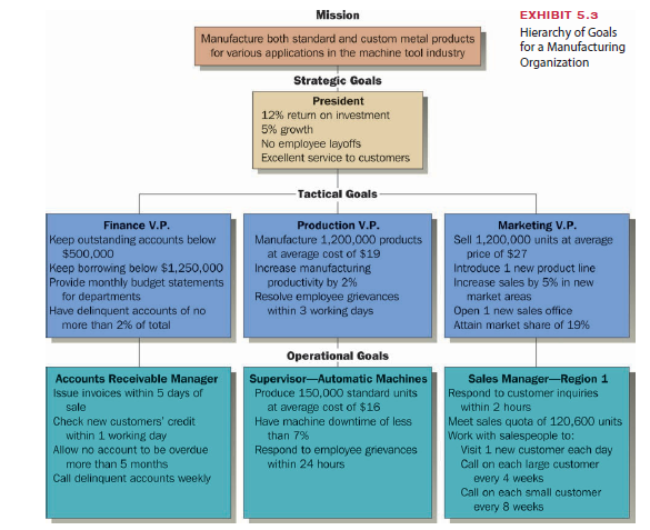 An example of a goal hierarchy is illustrated in Exhibit 5.3. Note how the strategic goal of “excellent service to customers” translates into “Open one new sales office” and “Respond to customer inquiries within two hours” at lower management levels.