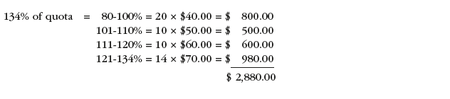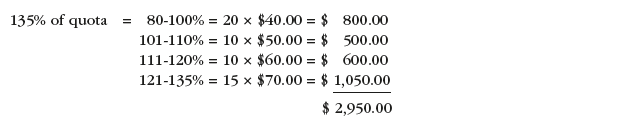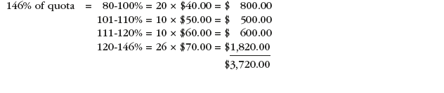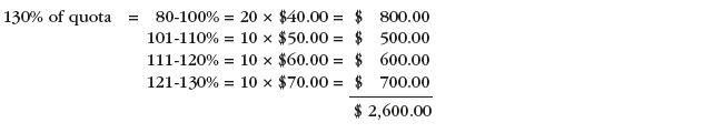 - 115% of quota = 20 x $30 = $600 + 10 x $40 = $400 + 5 x $50 = $250, for a total of $1,250.