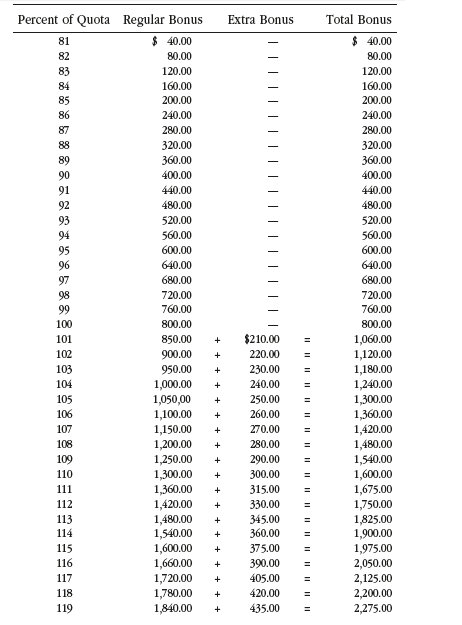 The Goodtime Equipment Company, Minneapolis, was a medium-sized manufacturer of playground equipment. The company produced an extensive product line and marketed its products nationwide. The field sales force numbered thirty-five persons, who were paid on a salary basis. In addition to the salary plan, Goodtime Equipment Co. had a bonus program for its sales personnel, whereby they could earn extra pay for achieving and surpassing their quotas. Over the past several months, R.J. McNeil, the sales manager, had received two recurring complaints from salespeople dissatisfied with certain elements in the existing bonus program. The staff complained about their bonuses being paid on a once-a-year basis, preferring instead to have the payments spread out over the year. And, although roughly 80 percent of the sales force had received bonuses in the past, some complained about the difficulty in achieving quotas. Specifically, the salespeople felt that their assigned quotas were set too high, keeping them from earning larger bonuses.