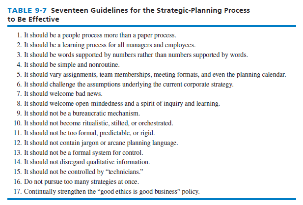 Strategic decisions require trade-offs such as long-range versus short-range considerations or maximizing profits versus increasing shareholders’ wealth. There are ethics issues, too. Strategy trade-offs require subjective judgments and preferences. In many cases, a lack of objectivity in formulating strategy results in a loss of competitive posture and profitability. Most organizations today recognize that strategic-management concepts and techniques can enhance the effectiveness of decisions. Subjective factors such as attitudes toward risk, concern for social responsibility, and organizational culture will always affect strategy-formulation decisions, but organizations need to be as objective as possible in considering qualitative factors. Table 9-7 summarizes important guidelines for the strategic-planning process to be effective.