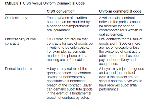- The adoption of international conventions and rules: There have been several attempts at unification of international contract law. The most recent attempt at progressive harmonization of the law of international trade is one undertaken by the United Nations Commission on International Trade Law (UNCITRAL). UNCITRAL produced a set of uniform rules (Convention on International Sale of Goods or CISG) on international trade that are a product of different national legal systems. CISG, which entered into force on January 1, 1988, governs the formation of international sales contracts and the rights and obligations of parties under these contracts. Many important trading nations, such as France, Germany, Italy, the Netherlands, Singapore, and the United States, have signed or ratified the convention (United Nations, 1984). As of September 2004, sixty-three countries accounting for more than two thirds of world trade have adopted the convention. CISG is largely identical to the provisions of the U.S. Uniform Commercial Code. However, there are several important distinctions (see Table 8.1). CISG applies to contracts for the commercial sale of goods between parties whose “places of business” are in different nations that have agreed to abide by the convention. “Place of business” is often interpreted to mean the country that has the closest relationship to the contract and is closest to where it will be performed, for example, the place where the contract is to be signed or the goods delivered. Parties to a sales contract are at liberty to specify the application of a law of some third country that recognizes the convention in the event of a dispute. CISG does not apply to certain types of contracts, such as sales of consumer goods, securities, labor services, electricity, ships, vessel, or aircraft, or to the supply of goods for manufacture if the buyer provides a substantial part of the material needed for such manufacture or production. CISG is intended to supersede the two Hague conventions (UNIDROIT rules) on international sales.