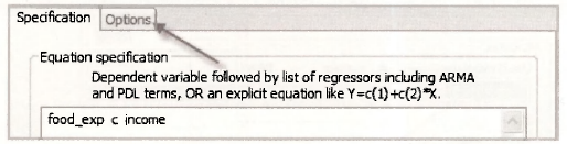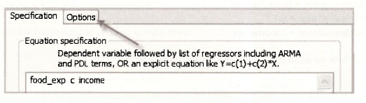 One option for correcting conventional least-squares interval estimates and hypothesis tests that are no longer appropriate under heteroskedasticity is to use what are known as White’s heteroskedasticity-consistent standard errors. These standard errors are obtained in EViews by choosing an estimation option. In the Equation Estimation box, click on the Options tab.