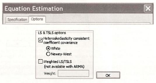 In the Options dialog box, the relevant “sub-box” is the one entitled LS & TSLS options. Select Heteroskedasticity consistent coefficient covariance followed by White. Click OK.