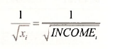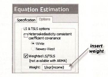 In this case, however, we select Weighted LS/TSLS from the LS & TSLS options. In the Weight box we type 1/sqr(income), where sqr is the EViews function for square root