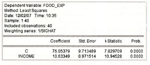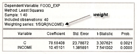 Check the output that follows. You will discover that it coincides with that given on page 204 of the text. You can tell that weighted least squares is the estimation procedure from the line that says Weighting series: 1/SQR(INCOME).