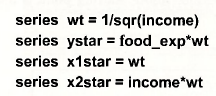 The long way to obtain weighted least squares estimates is to transform each of your variables by dividing by √INCOME as described on page 203 of the text, and to then apply least squares without the weights. The variables can be transformed by creating new series, or by dividing each variable by √INCOME in the equation specification. If you choose to create new series, the following commands are suitable.